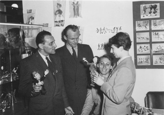 Fotka cca z roku 1945, kde plánují figurky Schleich. Za nimi také můžete vidět plakáty s plány.